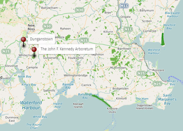 John F. Kennedy est mort assassiné à Dallas le novembre 1963. Son arrière grand-père, Patrick Kennedy (1823-1858) est né à Dunganstown, près de New Ross (Irelande, Comté de Wrexford) et, affamé, a quitté l'Irlande pour Boston en 1849. La nation irlandaise a voulu honorer la mémoire du défunt et de sa famille en créant un Arboretum de 252 ha à 10 min. du berceau familial, soit dans le Sud-Est de l'Irlande. Des fonds issus de dons privés ont rapidement été rassemblés et le parc a été inauguré en 1968. Il occupe un terrain de 252 ha au sommet et sur le flanc Sud de collines, bénéficiant d'un climat maritime et méridional idéal, sans gelées ou presque et sans sécheresses non plus. | ![]() |