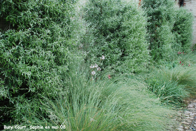 | Piet Oudolf a joué à fond la carte des gris en bordant le massif de graminées grises aussi (Helictotrichon sempervirens ?), flanquées à leur extrémité de romarins rampants. Quelques fleurs (entre autres, des Asphodèles ?) apportent un peu de couleur en mai. Les allées bombées sont dallées de pavés belges. | ![]() |