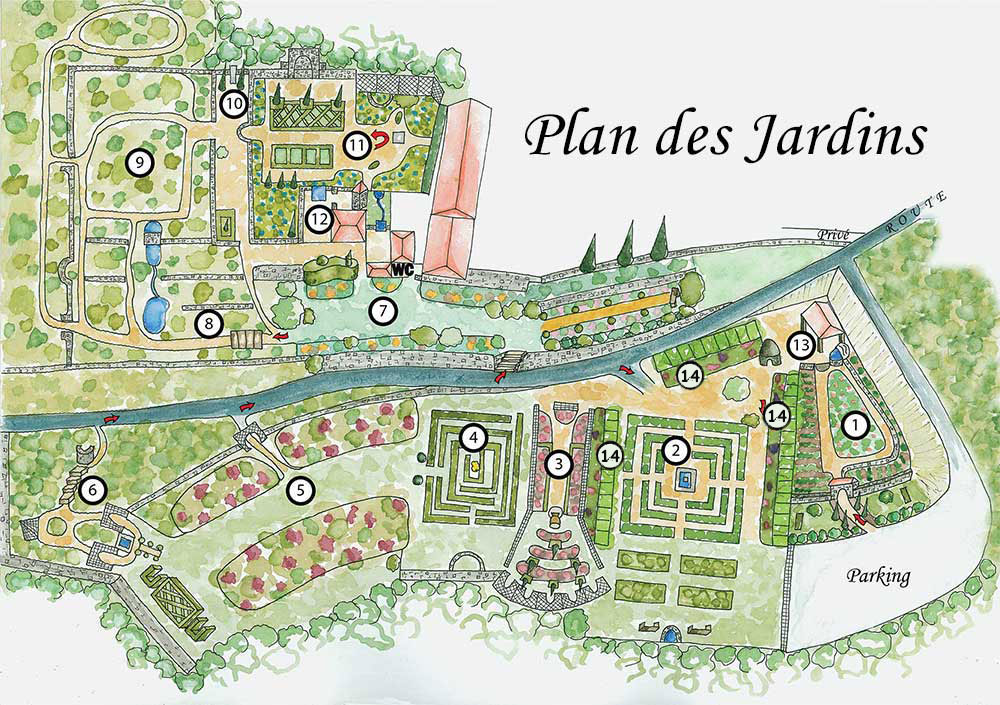 Croiriez-vous qu'il y a, sous les feuillages de ce vallon, plus de 10 jardins ? Et bien si! Le décor végétal presqu'intact, juste scandé de cyprès de Florence (Cupressus sempervirens), entretient le mystère et excite la curiosité... En cliquant sur le plan ou sur les éléments de la liste ci-joint, vous accédez aux parties du jardin concernées.