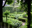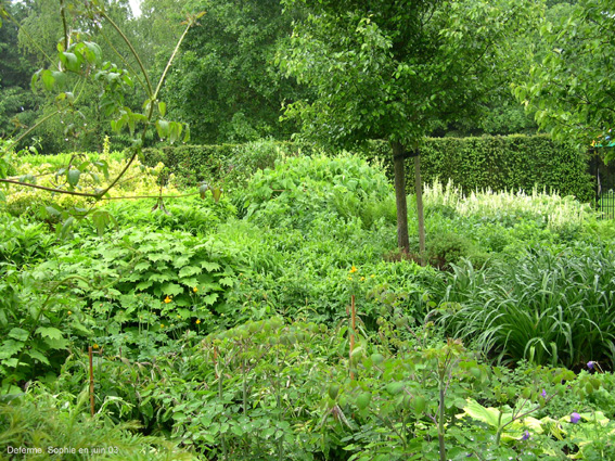 Plus loin, le sentier enjambe un ruisseau et se divise en deux. S'il choisit la gauche, le visiteur longe la hot border adossée à la haie d'if qui abrite le jardin des aromatiques, puis arrive au grand mixed-border bleu et jaune qui entoure la tonnelle et fait face à la prairie aux chevaux.