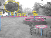 Le cercle et la sphère organisent l'espace: cercle du gazon, cercle de buis, cercle des troncs, sphère de la suspension centrale, sphère des arbustes taillés. Plusieurs éléments des massifs reprennent le thème: les sphères des aulx par exemple! | ![]() |