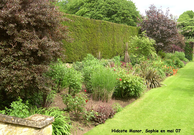 Ces deux longs massifs symétriques sont considérés comme le clou du spectacle offert par Hidcote. Le massif nord (ci-dessous) est adossé au mur du théâtre de verdure surmonté d'une haie d'ifs tandis que le massif sud est bordé de panneaux de bois ajourés. En mai 2002, nous avons été subjugués, et, 5 ans plus tard à la même saison, déçus! Les massifs étaient manifestement en remaniement. |