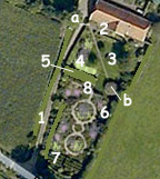 Côté Sud, c'est son domaine. On y entre par un étroit passage (a) près de la maison. A l'angle de la terrasse (2), démarre une diagonale (3) qui traverse la grande pelouse. A droite, un premier massif (4), protégé par un tunnel de haies (5), nous met en appétit. En s'avançant un peu dans la pelouse, on découvre, par une ouverture dans la haie ondulante (8), les grands massifs (6) qui font sa réputation. Les graminées y ondoient entre des vagues de haies et des piliers d'ifs (7) rassurants. Comme à Bury Court, les cercles bâtissent l'espace.