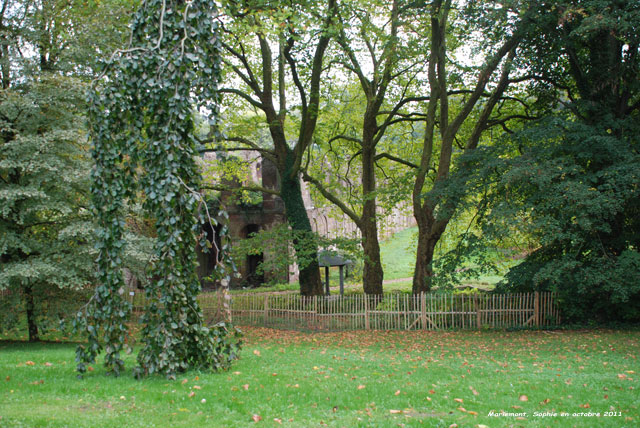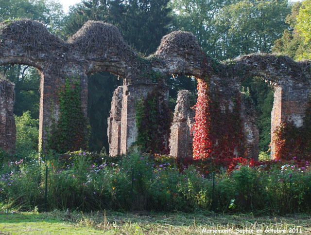 Près de la roseraie et des séquoias, le terrain descend et les plantations se font plus denses. Doucement, entre les feuillages, apparaissent des ruines.