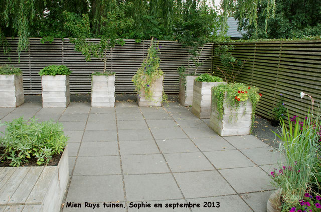 Deux côtés de la terrasse sont limités par un lattis de bois ajouré et les deux autres par une haie d'érables champêtres (Acer campestre) puis de Thuja.