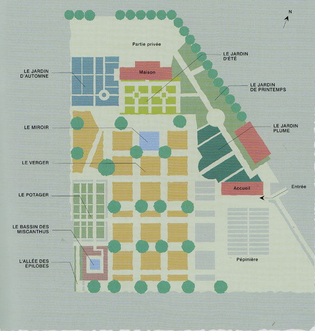 Et après quelques mois de réflexion, ont aménagé l'espace dans un style naturaliste structuré par un plan très rigoureux: des allées rectilignes se croisent à angle droit et les massifs ainsi délimités sont tous quadrangulaires. L'unique diagonale, à peine perceptible sur place, est imposée par les limites du terrain.