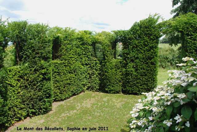 Au bout du jardin de printemps, près de la maison, des ifs forment un recoin.