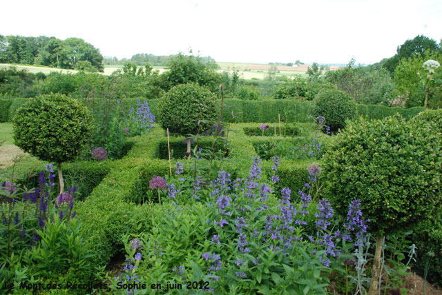 Quelques topiaires taillés en boule et des ifs dressés ajoutent la troisième dimension et relévent le regard qui se perd dans les brumes bleutées de la plaine.