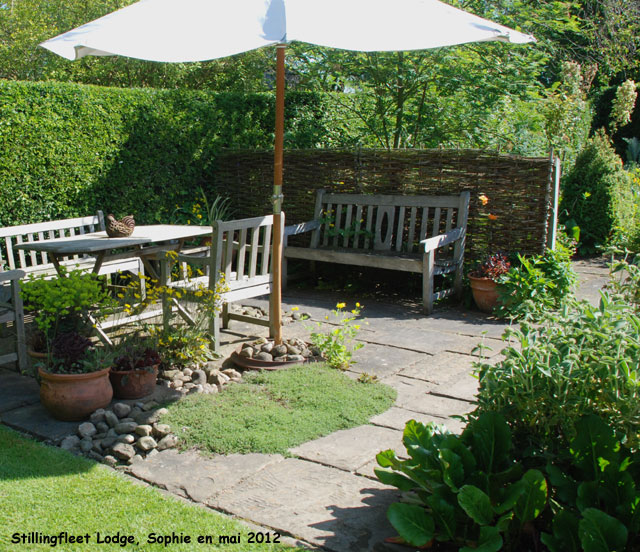 La simplicité géométrique du beau dallage de pierres est interrompue et allégée par quelques galets, des pots et une plante tapissante.
