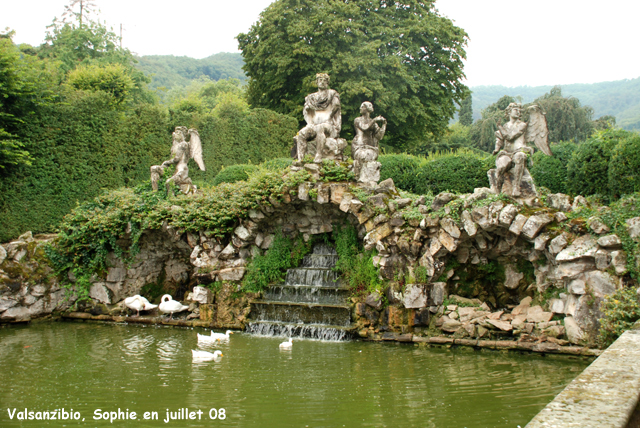 En aval de la fontaine de Pila, l'eau descend vers le bassin des dieux des vents. Ellle dégouline d'une rocaille baroque veillée par Eole, Zéphyr, Borée et Deiopée.