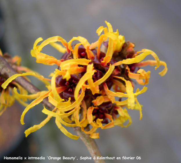 | L'arbuste a une silhouette dressée de 4 m. de haut sur 3 m. de large. Les fleurs oranges s'épanouissent en février. Les pétales de 26 mm., de long sur 1 mm. de large, sont tordus en patte d'araignée. Ils sont rouge clair liserés de jaune. Le calice est rouge brun. Les fleurs sont malheureusement sans parfum. Au printemps, les feuilles sont jaune vert, tachées de bronze. En été, elles sont vertes et, en automne, elles jaunissent puis virent rapidement au brun. La variété a été obtenue par A. Kort à Kalmthout. A l'initiative du Comité scientifique de Kalmthout, le nom a été choisi par les visiteurs du parc en 2001. | ![]() |