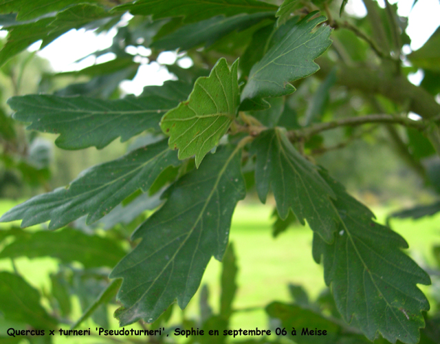 | Issu de Q. ilex x Q. robur et obtenu dans la pépinière de Mr Turner dans l'Essex, fin 18è. Depuis, il a été observé à l'état naturel au pays basque espagnol en 2001. |